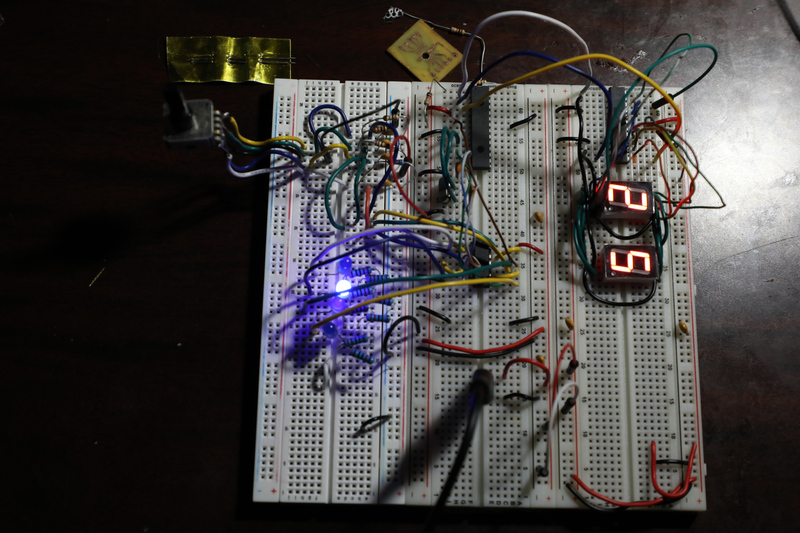 The rightmost breadboard was replaced and all of the components were replaced into another breadboard. The encoder section of the circuit (leftmost breadboard) had 10k resistors removed and the signals from the encoder had more fidelity. The encoder signals were routed to the 74LS00 (which acts as an isolation to the MCU and an inversion) and the output of those are connected to the Atmega328P. The Code was then updated and we have a visible reading from the seven segment displays. But not everything is working. The Segment displays do not output a live reading from the enocder very well. ![]()