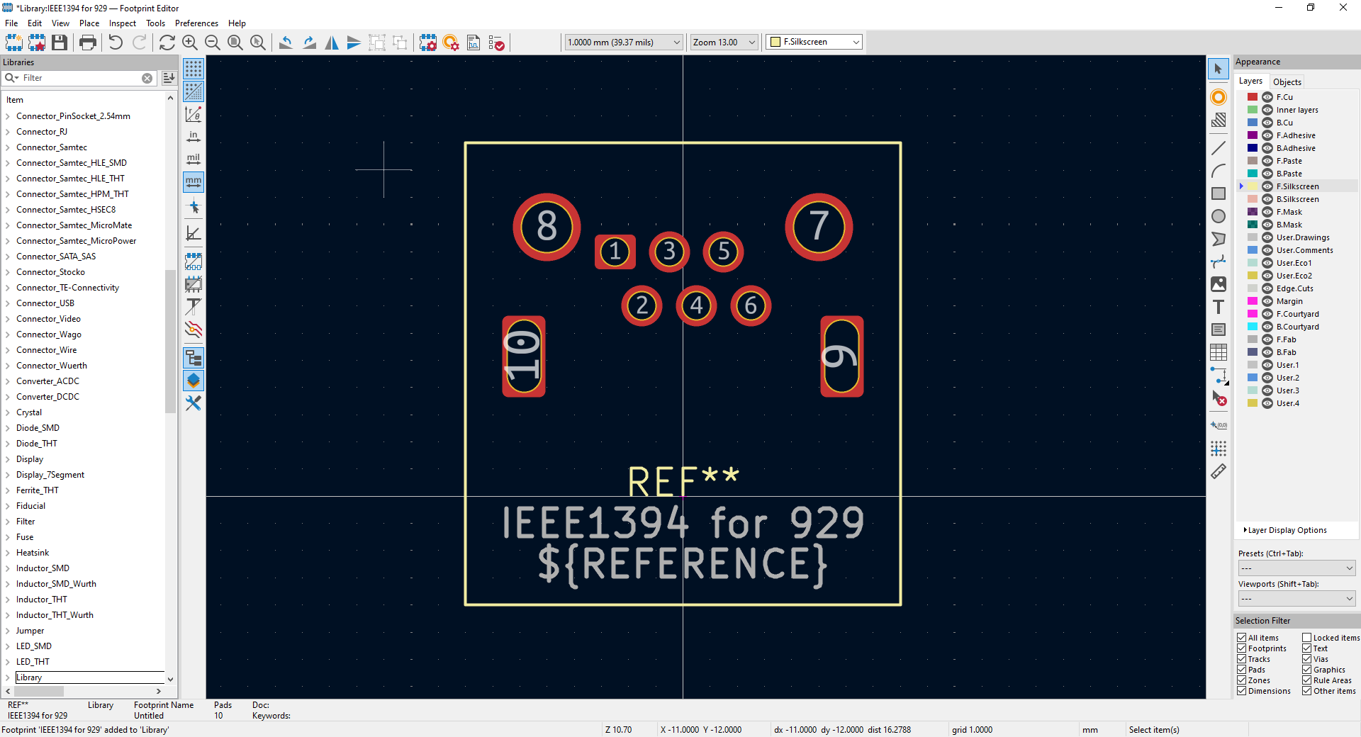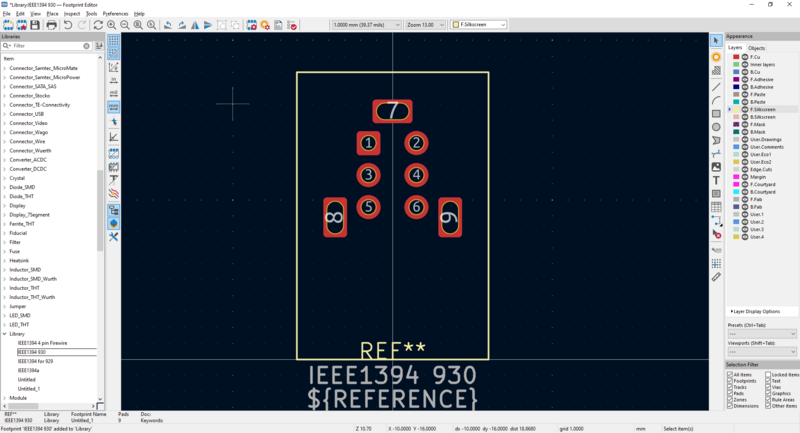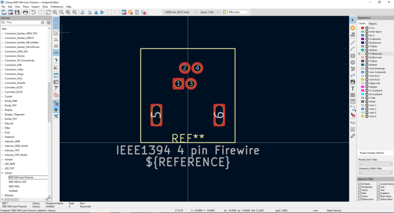 The 4 pin Firewire ordered from here had a footprint provided and my custom footprint was modeled from that.