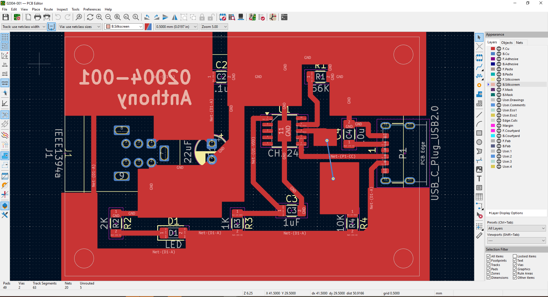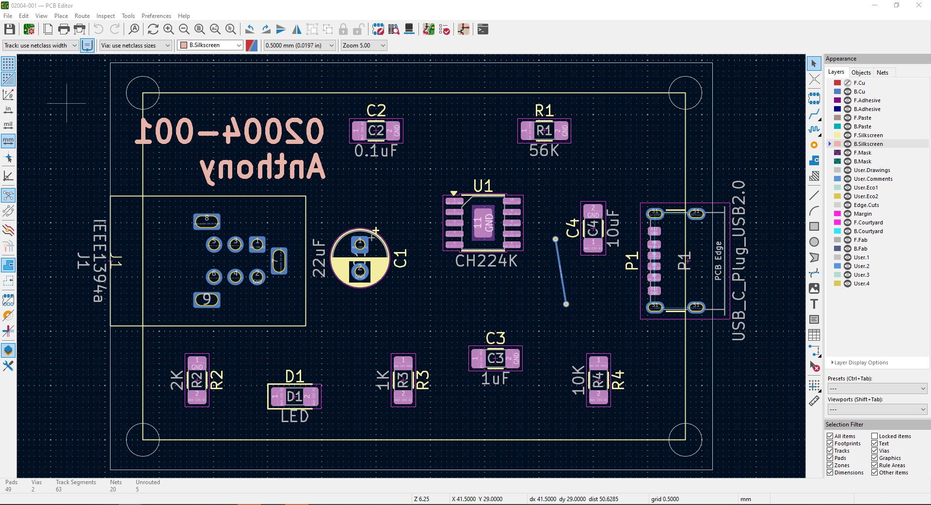In a previous revision, the USB-C pad connections A12 and B12 were not connected. They should have been connected, otherwise a usb c male plug can only be inserted one way. If inserted in reverse, the plug is unconnected. B9 and A9 are now connected. It's a standard for those to be connected on this component. In a past revision, the CCs were connected together. It's hypothesized that it's better for a PD charger (that can charge 5V, 9V, 12V, 15V, and/or 20V) to communicate with the CH224k IC if pin 7 (CH224K) was connected to the USB-C B5. (Especially for Apple devices).