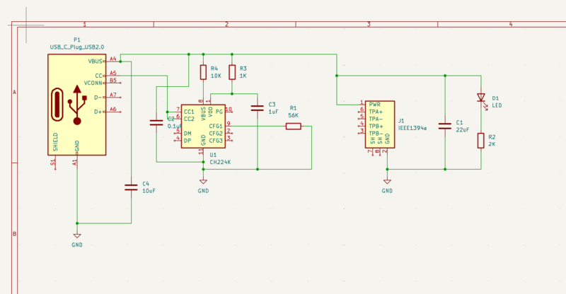 A couple of days ago, I was tasked to create a PCB that essentially converts power from a USB-C to a firewire socket. A rough schematic was made and a