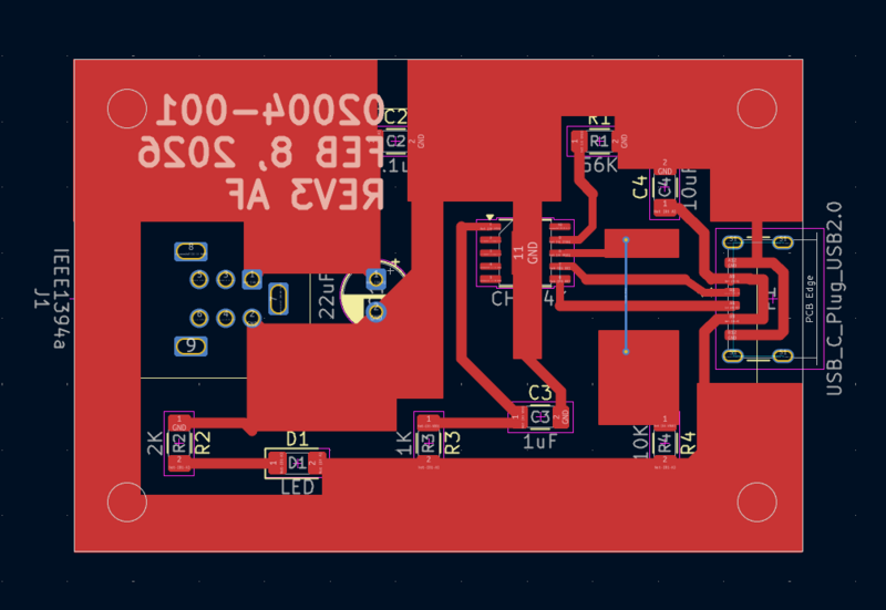 Last week I made a parts List that's necessary for the manufacture of the 02004. That list can be found here. The list is comprised of sized 1206 components of capacitors, resistors, and an LED. This list also includes Different IEEE1394 Firewires. The 4 pin firewire is not considered anymore due to it being a data transfer component. These Firewires can also be found on Aliexpress. The CH224K ICs are available on aliexpress. They have such a small form factor but are the largest of those types. When ordering the parts, if ordering from Aliexpress it will likely take more than two weeks.