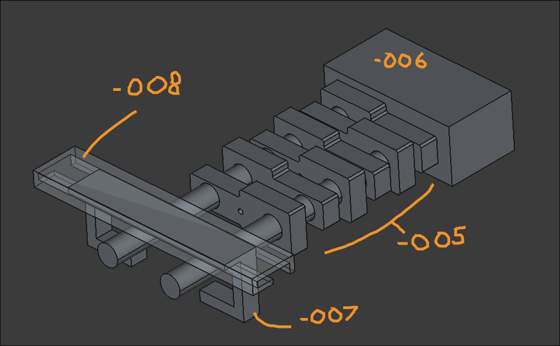 Concepted out Hackaday contest entry, a gravity powered curtain opener/closer. Designed four simple components in 3D that allow weights tied to the center hole of the -005 components to sequentially slide out of a carriage assembly and thereby draw the curtains opened and closed. The -007 slider is connected either to some servo or a bimetallic strip. As it slides inside the -008 channel, at either extreme, it makes an opening for the next -005 sliding component to fall by gravity out of the carriage. A frame will be necessary to hold the -008 and -006 components in relative position, as well as the motion input system. ![]()