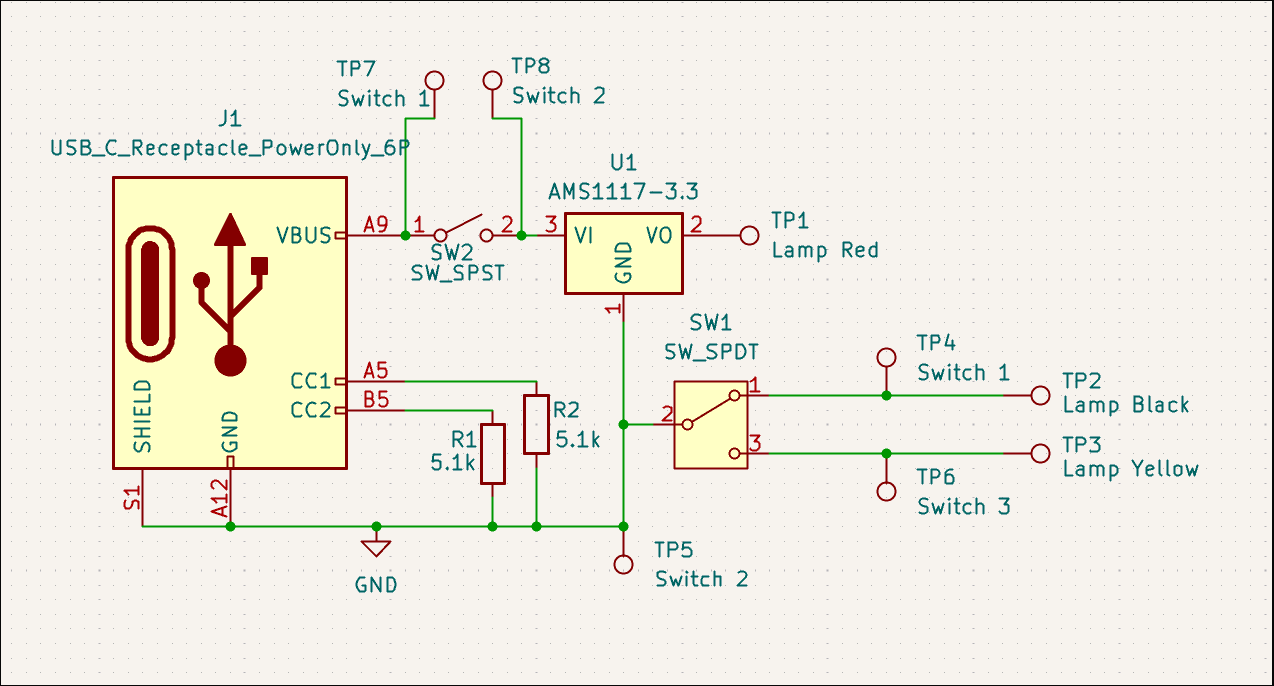 Started first repair/salvage effort for a USB power strip/lamp. The issue was identified to be a shot diode and power IC, which will not be replaced due to prohibitive cost. Instead, the lamp will be salvaged. A board was designed to provide ~3V from USB-C with some toggle switches to control the lamp color and turn on/off the light. All the wires will be soldered to the board at the test points. ![]()